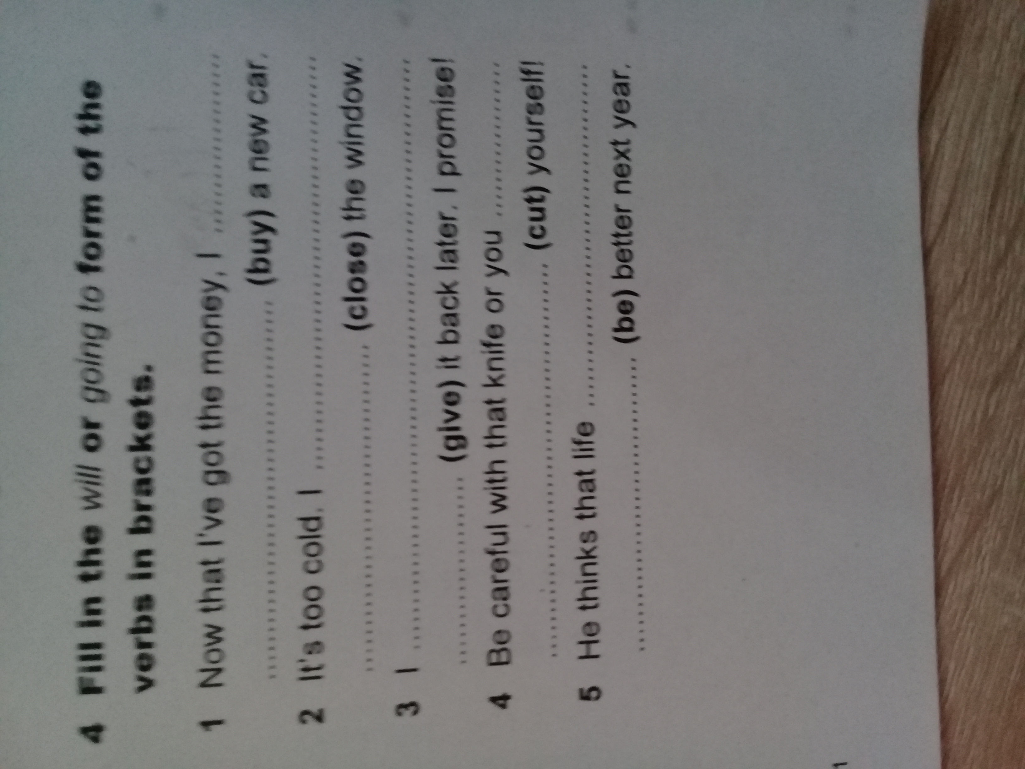 1. I'm going to buy, 2. I'll close, 3. I'm goin to give, 4. you'll cut, 5. will be
