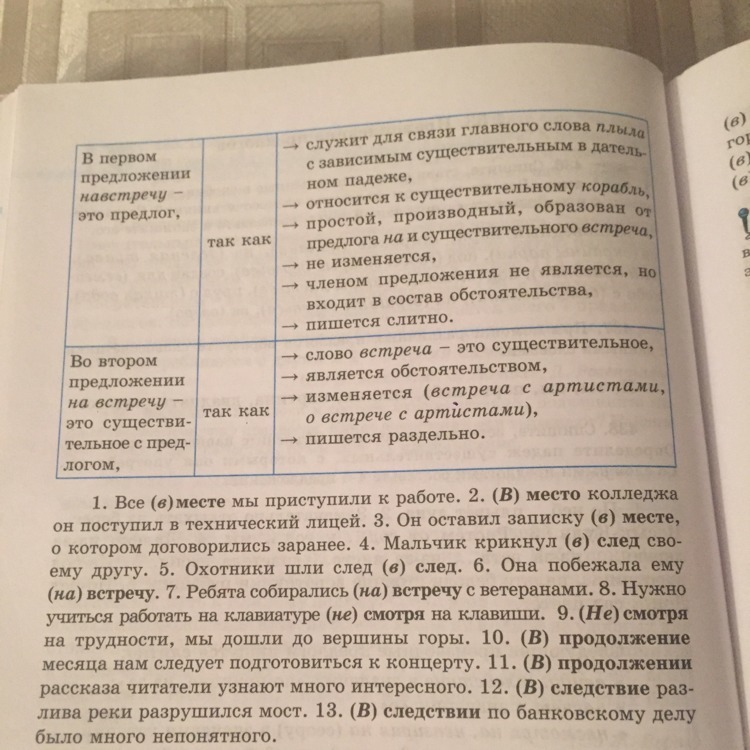 1. Все вместе мы приступили к работе. 2. В место колледжа он поступил в технический лицей. 3. Он оставил записку в месте, о котором договорились заранее. 4. Мальчик крикнул вслед своему другу. 5. Охотники шли след в след. 6. Она побежала ему навстречу. 7. Ребята собирались на встречу с ветеранами. 8. Нужно учиться работать на клавиатуре, не смотря на клавиши. 9. Несмотря на трудности, мы дошли до вершины горы. 10. В продолжение месяца нам следует подготовиться к концерту. 11. В предложении рассказа читатели узнают много интересного. 12. Вследствие разлива реки разрушился мост. 13. В следствии по банковскому делу было много непонятного.