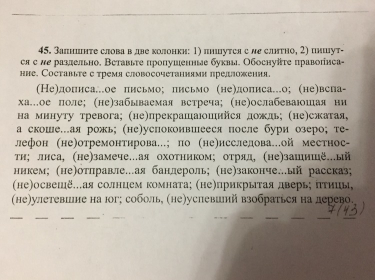 недописанное письмо; письмо не дописано; невспаханное поле; незабываемая встреча; не ослабевающая ни на минуту тревога; непрекращающийся дождь,не сжатая, а скошенная рожь; не успокоившееся после бури озеро; телефон не отремонтирован; по неисследованной местности; лися, незамеченная охотником; отряд, не защищенный никем; не отправляемая бандероль; незаконченный рассказ; не освещенная солнцем комната; неприкрытая дверь; птицы не улетевшие на юг; соболь, неуспевший взобраться на дерево.