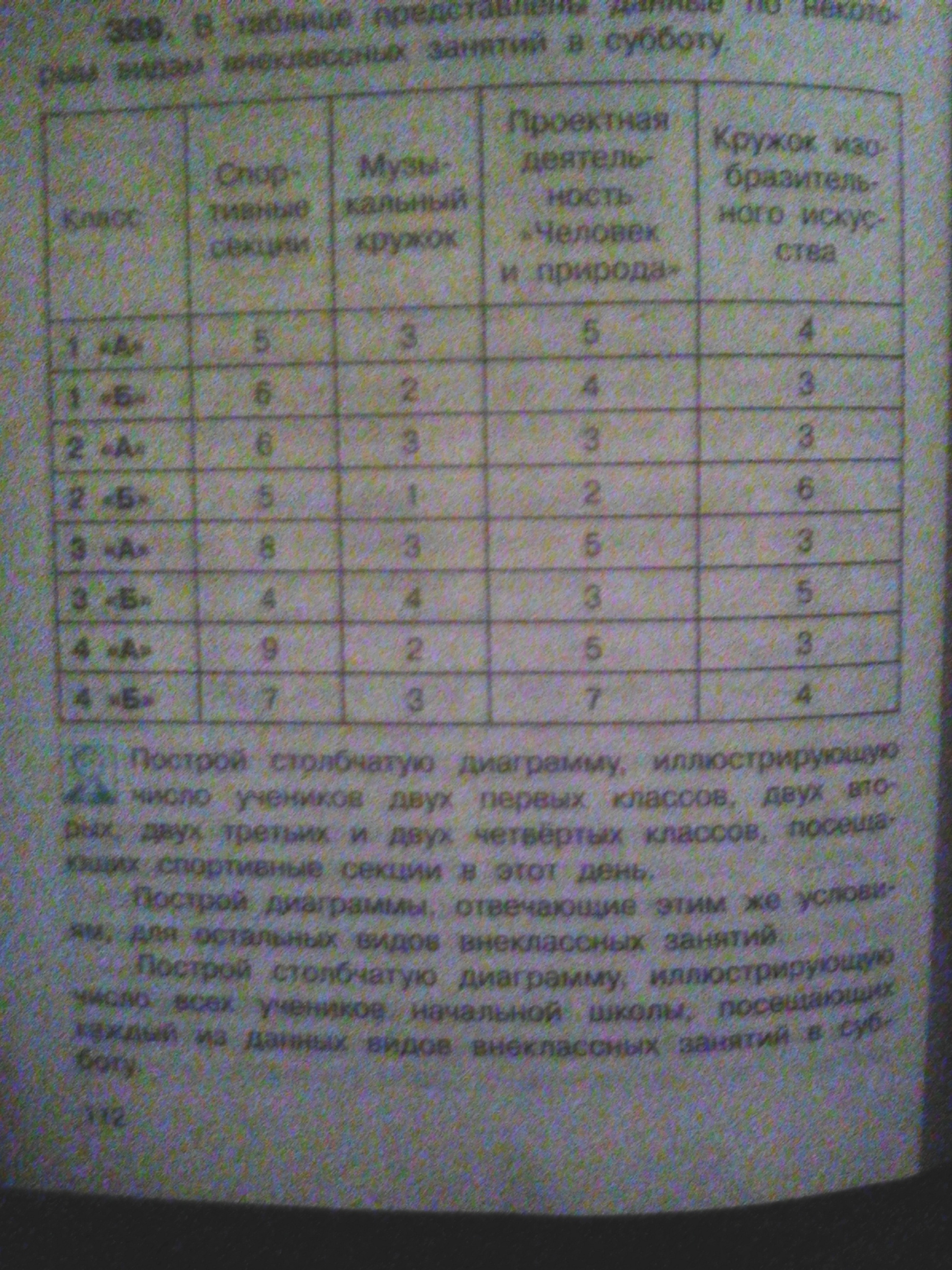 3) построй столбчатую диаграмму, иллюстрирующую число всех учеников начальной школы, посещающих каждый из данных видов внеклассных занятий в субботу.