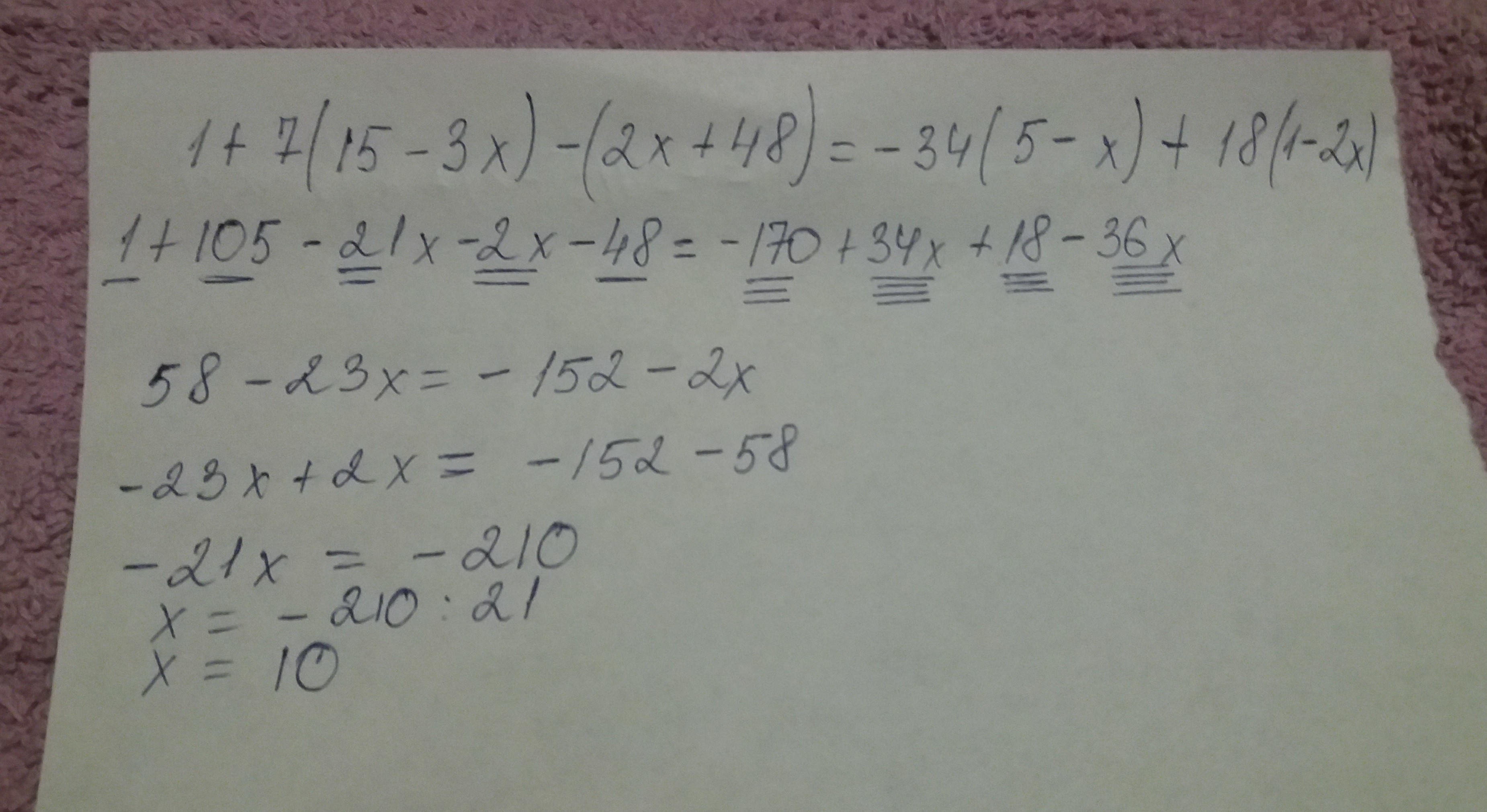 1+7(15-3х)-(2х+48)=-34(5-х)+18(1-2х)