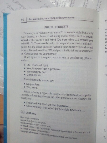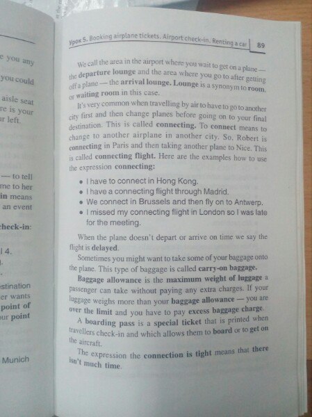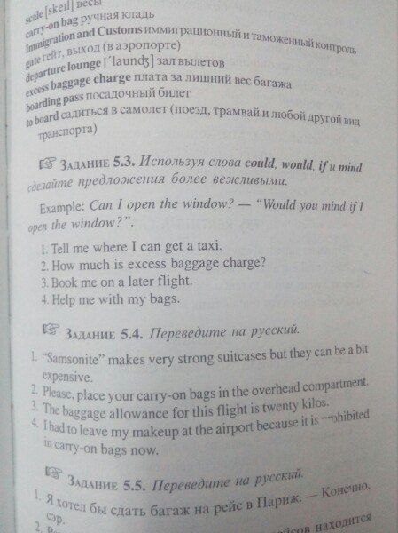сотр: Да, конечно. Сегодня все идет вовремя. Дайте пожалуйста Ваш билет и паспорт. Вы регистрируете какой-нибудь багаж?