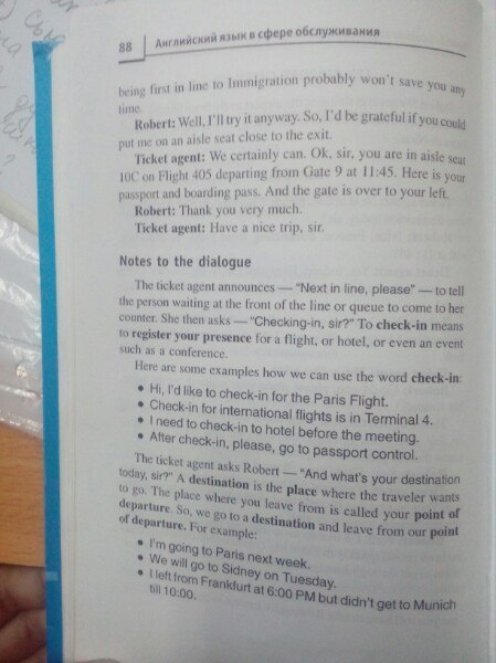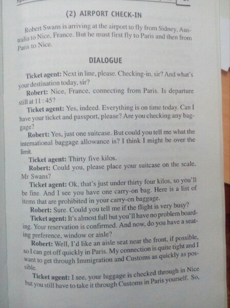 Р: Хорошо, но я все равно попробую. Был бы благодарен, если вы дадите мне место у прохода и ближе к выходу.сотр: конечно можем. У Вас место ... на рейсе .... вылетающим в ...., выход на посадку.... . Вот Ваш паспорт и билет. Ворота сзади и налево.
