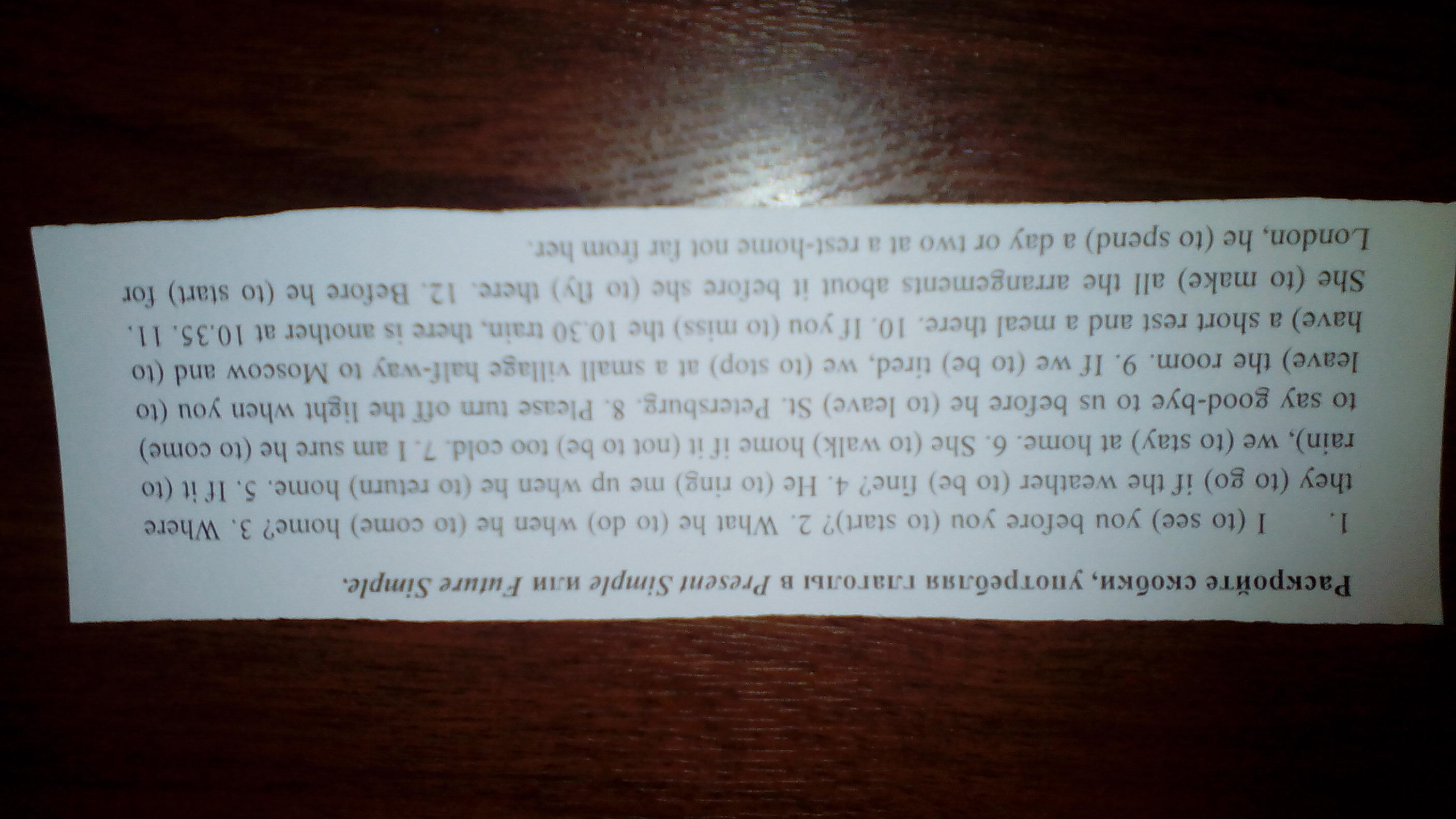 1. Will I see you before you start? 2. What will he do when he comes home? 3. Where will they go if the weather is fine? 4. He will ring me up when he returns home. 5. If it is raining, we shall stay at home. 6. She will walk home if it is not too cold. 7. I am sure he will come to say good-bye to us before he leaves the city. 8. Please turn off the light when you leave the room. 9. If we are tired, we will stop at a small village half-way to our city and have a short rest and a meal there. 10. If you miss the 10.30 train, there is another at 10.35. 11. She will make all the arrangements about it before she flies there. 12. Before he starts for London, he will spend a day or two at a rest-home not far from here.