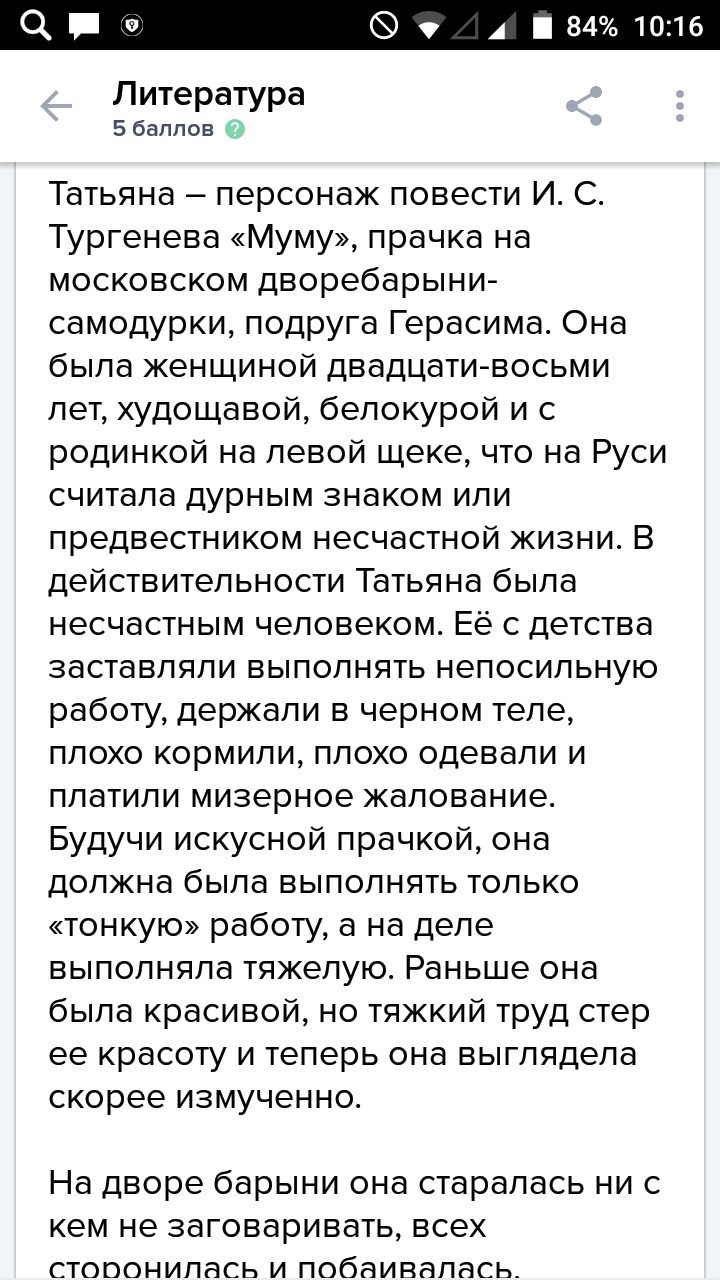 Татьяна – персонаж повести И. С. Тургенева «Муму», прачка на московском дворебарыни-самодурки, подруга Герасима. Она была женщиной двадцати-восьми лет, худощавой, белокурой и с родинкой на левой щеке, что на Руси считала дурным знаком или предвестником несчастной жизни. В действительности Татьяна была несчастным человеком. Её с детства заставляли выполнять непосильную работу, держали в черном теле, плохо кормили, плохо одевали и платили мизерное жалование. Будучи искусной прачкой, она должна была выполнять только «тонкую» работу, а на деле выполняла тяжелую. Раньше она была красивой, но тяжкий труд стер ее красоту и теперь она выглядела скорее измученно.