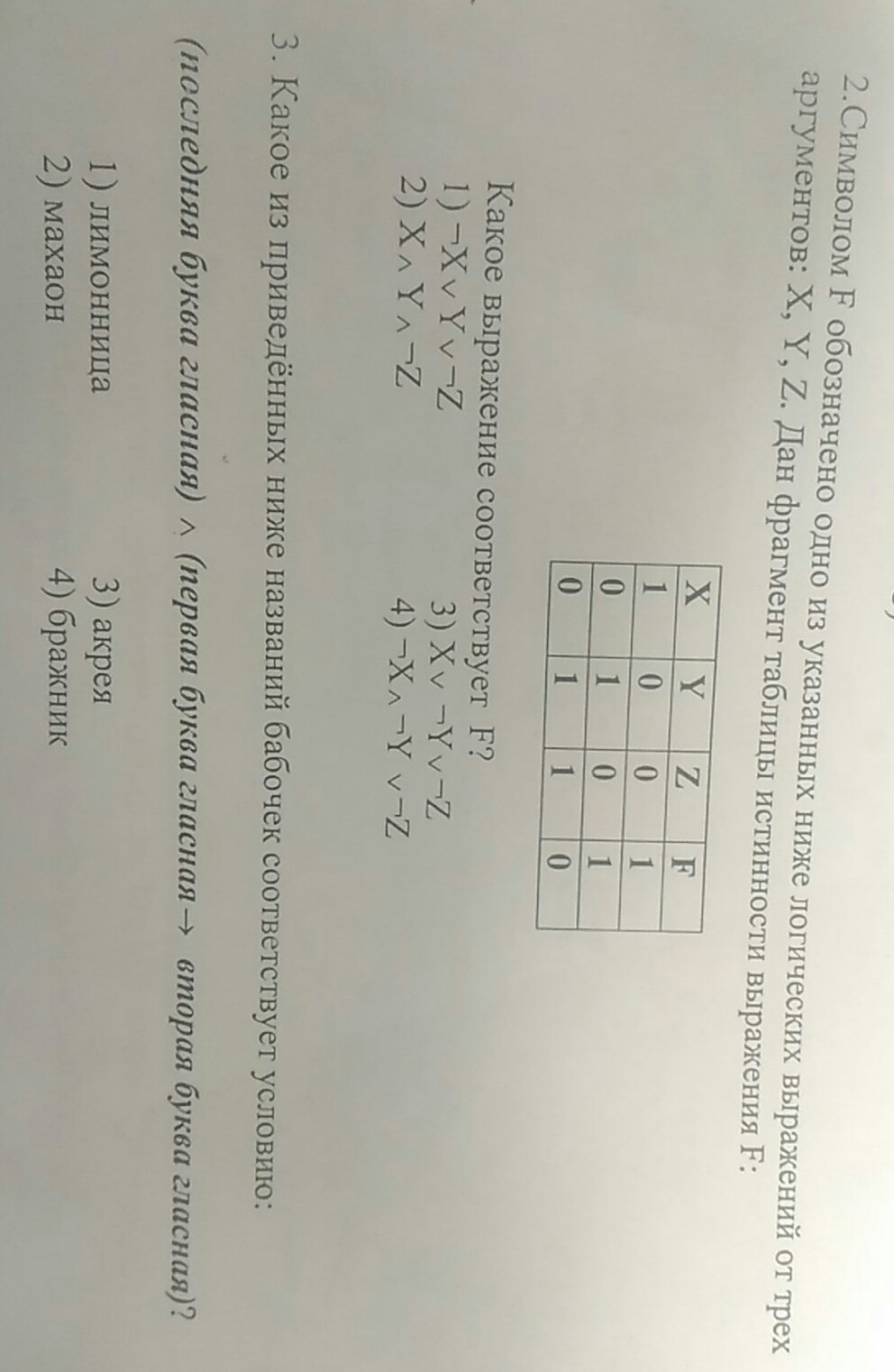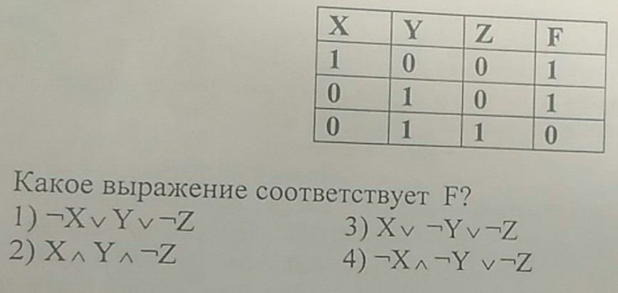 2) В выражении X,Y и ¬Z связаны через "И". Достаточно ложности одного из них, чтобы выражение было ложным, а истинно оно оно только если истинны все три. Проверяем первую строку таблицы: Y ложно, а F истинно. Этот вариант тоже отбрасываем.