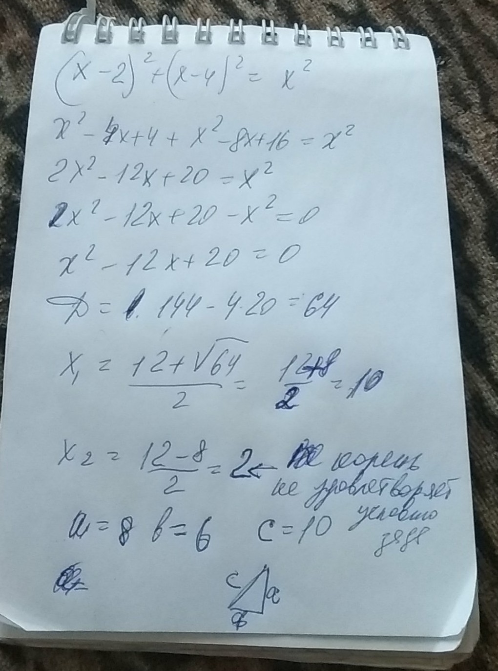 Найдите длины сторон прямоугольного треугольника, если известно, что один из катетов на 4 см меньше гипотенузы, а другой на 2 см.