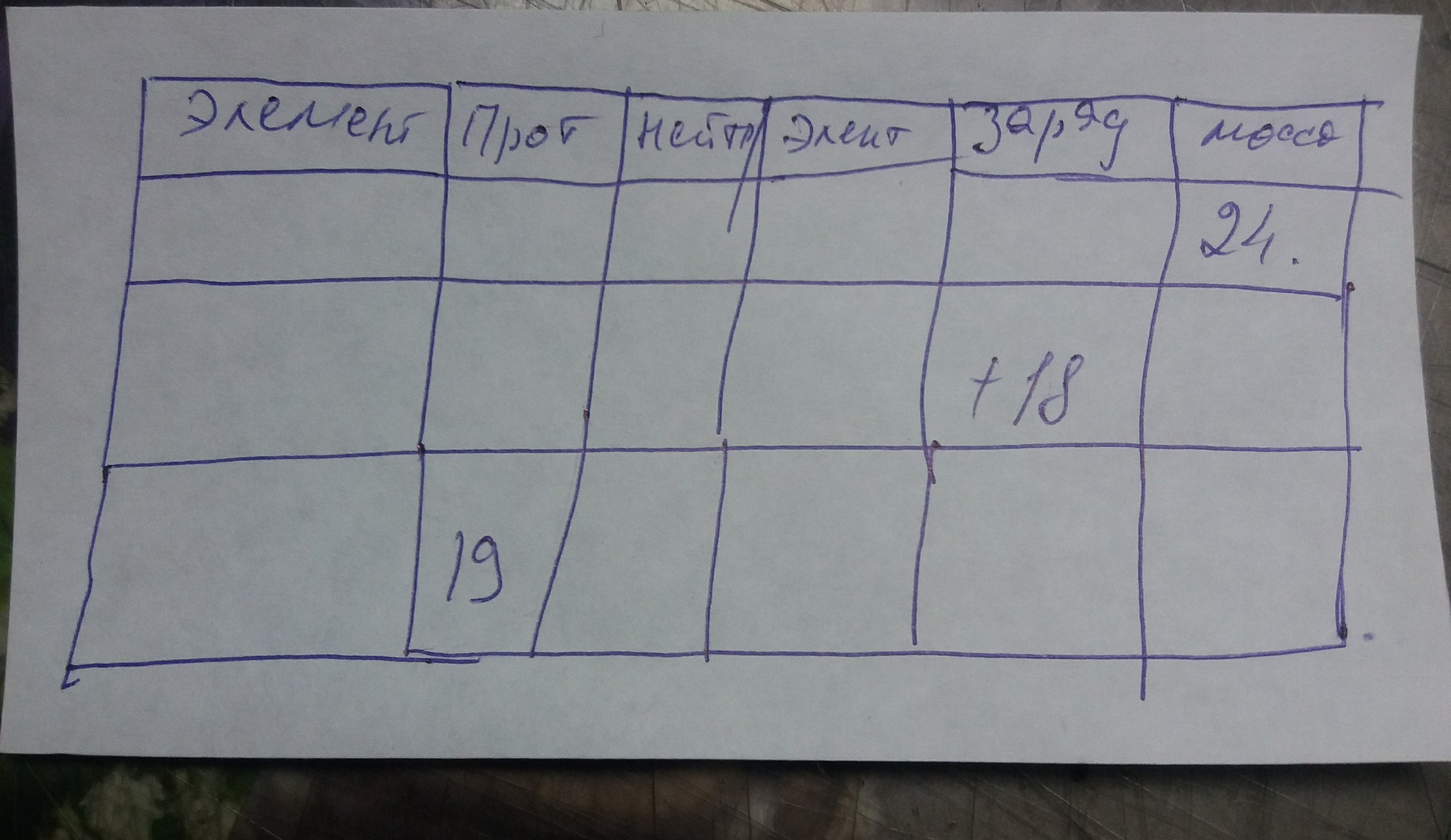 1-й элемент это Mg ( магний). Протонов у него 12, нейтронов 12,электронов тоже 12,заряд +12,масса 24.