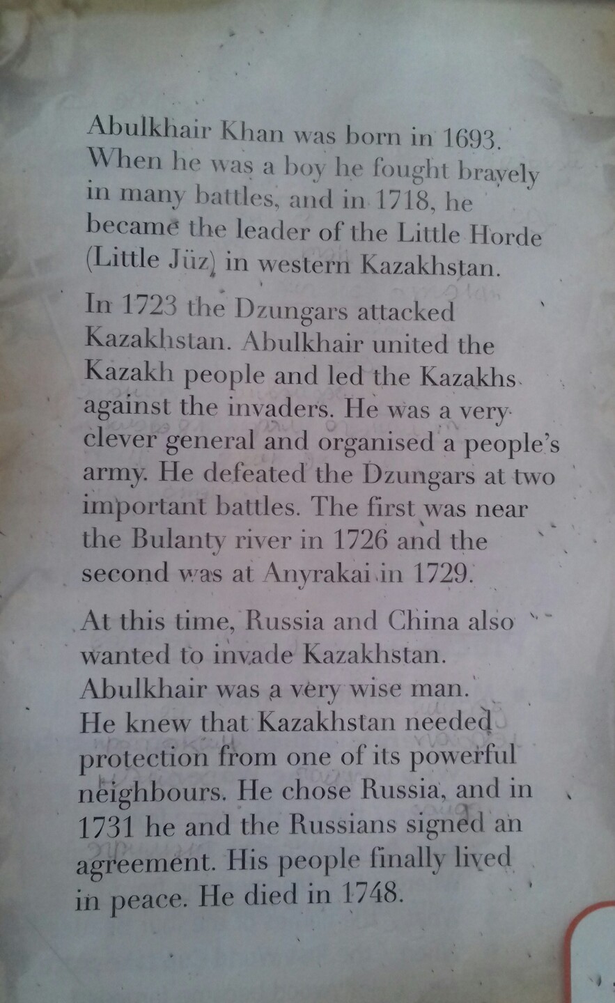 Хан Абулхайр радился в 1693. Когда он был мальчиком он храбро сражался во многих битвах и в 1718 стал лидером Малой Орды в восточном Казахстане.