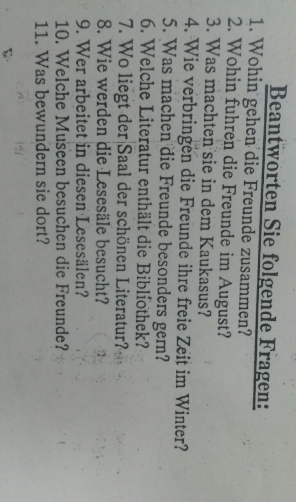 1. Die Freunde gehen nach Sportclub zusammen. - Друзья вместе идут в спортивный клуб. (wohin - переводится куда?)2. Im August fuhren (прошедшее простое, множественное число) die Freunde fuhren (прошедшее простое, множественное число) nach Alaska. - В августе друзья отправились на Алексу (wohin - переводится куда?, fahren/fuhr/gefahren)3. Sie kaufte die Süßigkeiten in dem Kaufhaus. - Она купила конфеты в универмаге. (was - что, прошедшее простое, единственное число)4. Die Freunde gehen auf die Straße, Schneeball spielen, Schlieben fahren und Schlittschuh laufen im Winter. - Друзья выходят на улицу, играют в снежки, катаются на санках и катаются на коньках. (настоящее, множ. число, wie - как) 5. Die Freunde spielen Fußball besonders gern. - Друзья любят играть в футбол.(настоящее, множ. число, was - что) 6. Die Bibliothek enthält die Klassikliteratur, die Jugendliteratur, die Fachliteratur und die Weltliteratur. - Библиотека содержит классическую литературу, молодежную литературу, специальную литературу и всемирную литературу. (welche - какую, простое настоящее)7. Der Saal der schönen Literatur liegt neben dem Brunnen. - Зал c хорошей литературой расположен рядом с фонтаном. (wo - какую, простое настоящее)8. Die Lesesäle werden von 9 Uhr bis 18 Uhr besucht. - Читальные залы посещаются с 9 утра до 6 вечера. (простое настоящее, пассив, wie - как)9. Hugo Stiglitz arbeitet iin diesen Lesesälen. - Хьюго Стиглиц работает в этих читальных залах. (простое настоящее, пассив, wer - кто)10. Die Freunde wir suchen die Ermitage, das Russische Museum, die Kunstkamera, Puschkin und Dostojewski Museen. - Друзья посещают Эрмитаж, Русский музей, Кунсткамеру, музеи Пушкина и Достоевского.(простое настоящее, пассив, welche - какие).11. Sie bewundern die Natur. (простое настоящее, пассив, was - что). - Они восхищаются природой.