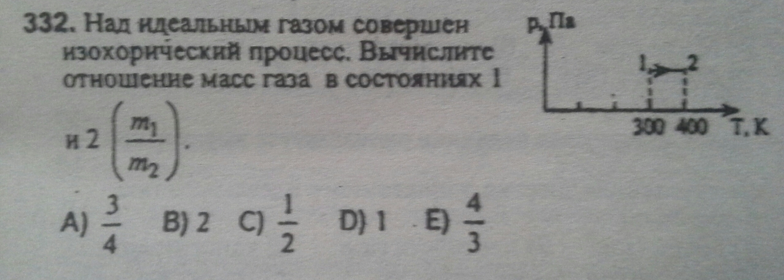 Над идеальным газом совершен изохорический процесс. Вычислите отношение масс газа в состояниях 1 и 2 (указано на рисунке).