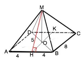 1) Апофема МО - гипотенуза прямоугольного ∆ МОН. По т.Пифагора МО=√(MH²-HO²)=√(25-16)=3 см