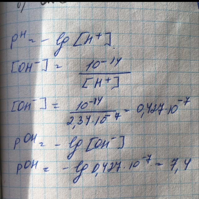 Вычислите pОH крови крупного рогатого скота, концентрация катионов водорода в которой составляет 2,34*10^-7 моль/л