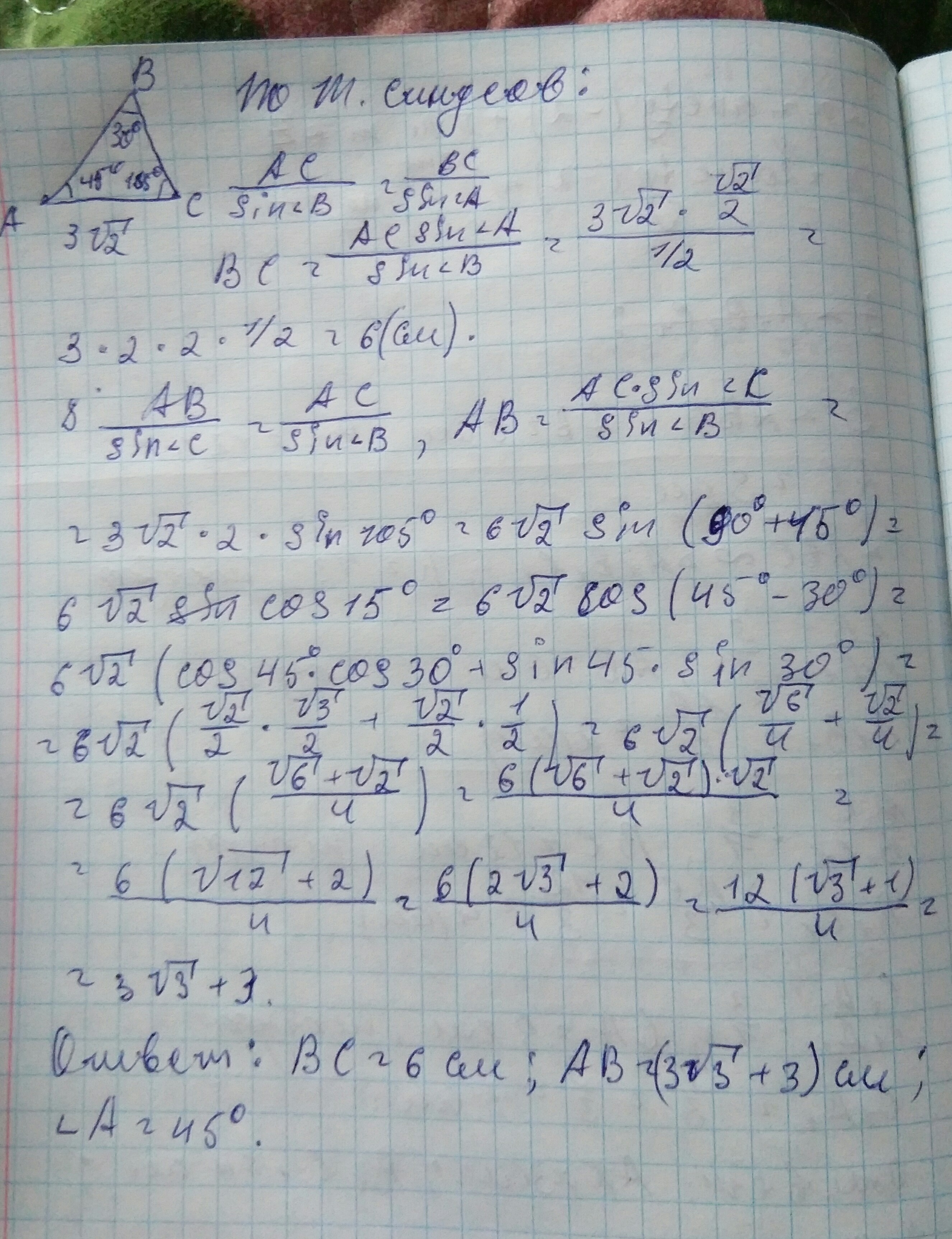Решить треугольник АВС, если АС=3 корень 2,угол В=30 градусов, угол С =105 градусов. Помогите пожалуйста.
