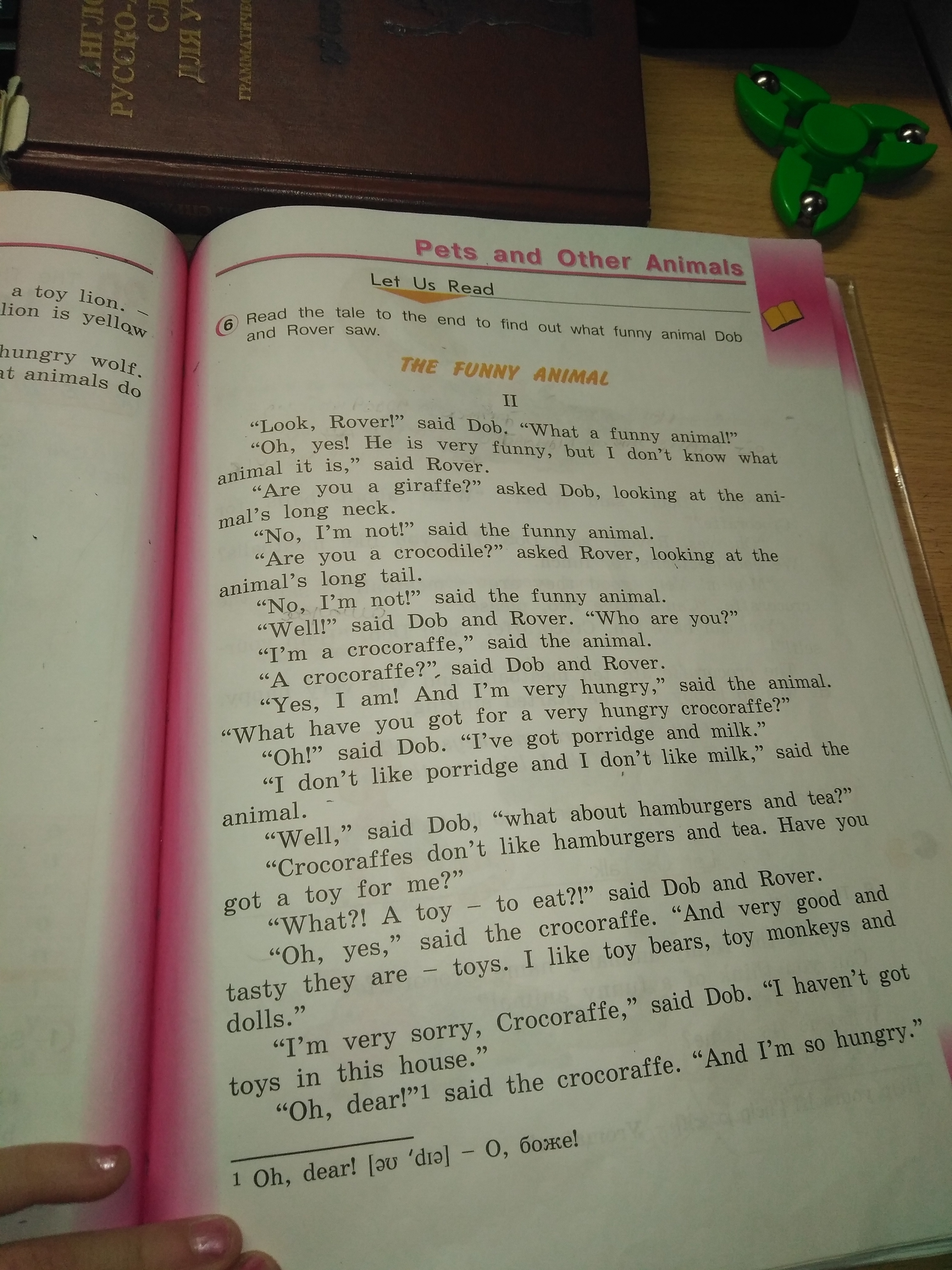 Смотри Ровер! - сказал Доб, "Какой забавный зверь""Да!Он и вправду очень забавный,но я не знаю что это за зверь" - сказал Ровер"Ты жираф?" - спросил Доб,смотря на длинную шею зверя"Нет!"- ответила забавный зверь"Ты крокодил?"- спросил Ровер,смотря на длинный хвост зверя"Нет!" - ответил забавный зверь"Ладно!" - сказали Доб и Ровер - Кто ты?"Я крокораф" - ответил зверь"Крокораф?" - сказали Доб и Ровер"Да,это так!И я очень голоден"- сказал зверь"Что у тебя есть для очень голодного крокорафа?"О!" - ответил Доб - "Каша и молоко.""Я не люблю кашу и молоко" - сказал зверь"Ладно" - сказал Доб - "Что насчёт гамбургера и чая?""Крокорафы не любят гамбургеры и чаи.У тебя есть игрушка для меня?""Чего?!Игрушка для еды?!"- сказали Доб и Ровер"Да" - ответил крокораф."Игрушки очень хороши и вкусны.Мне нравятся игрушечные медведи,обезьянки и куклы.""Мне очень жаль,Крокораф" - сказал Доб - "У меня нет игрушек в этом доме""О боже" - сказал крокораф. "Я такой голодный."