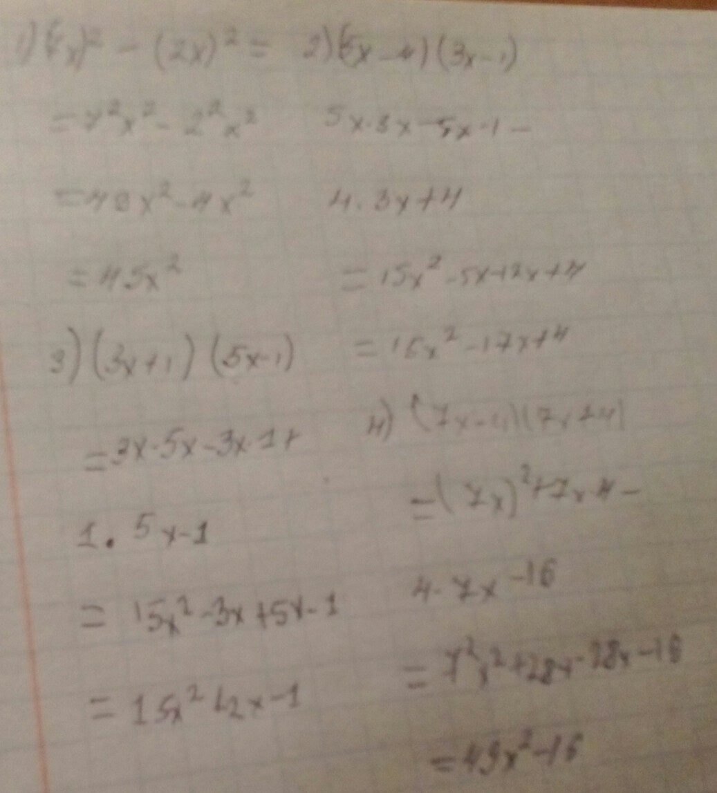 Вычислить. 1) (7х)^2-(2х)^2. 2) (5х-4)*(3х-1) 3) (3х+1)*(5х-1). 4) (7х-4)*(7х+4) решите пожалуйста !!!!!