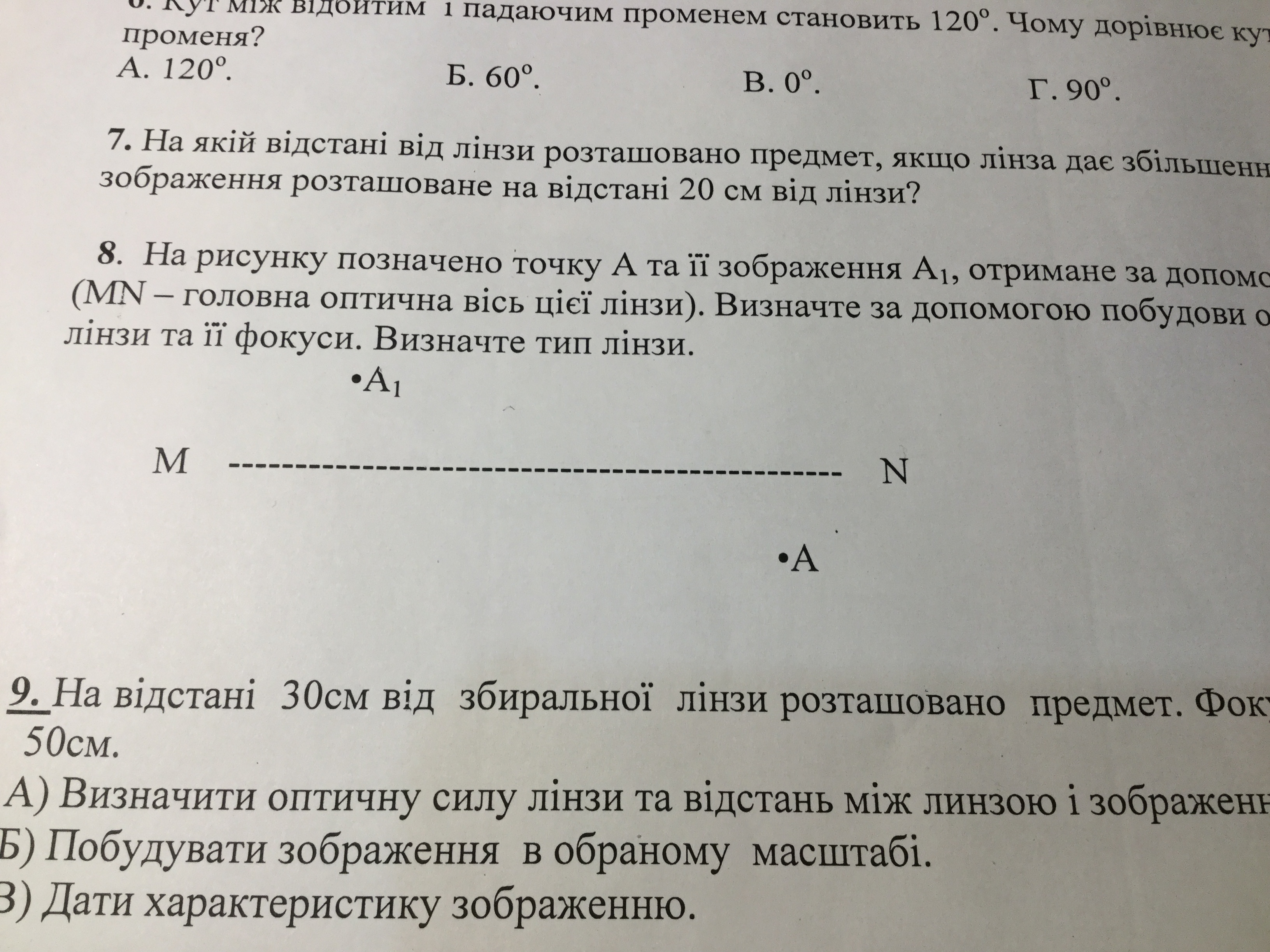 2)На рисунке отмечено точку А и её изображение А1,одержанное с помощью линзы (MN-главная оптичная весь этой линзы).Определите с помощью постройки опричного центра линзы и её фокусы.Определите тип линзы.
