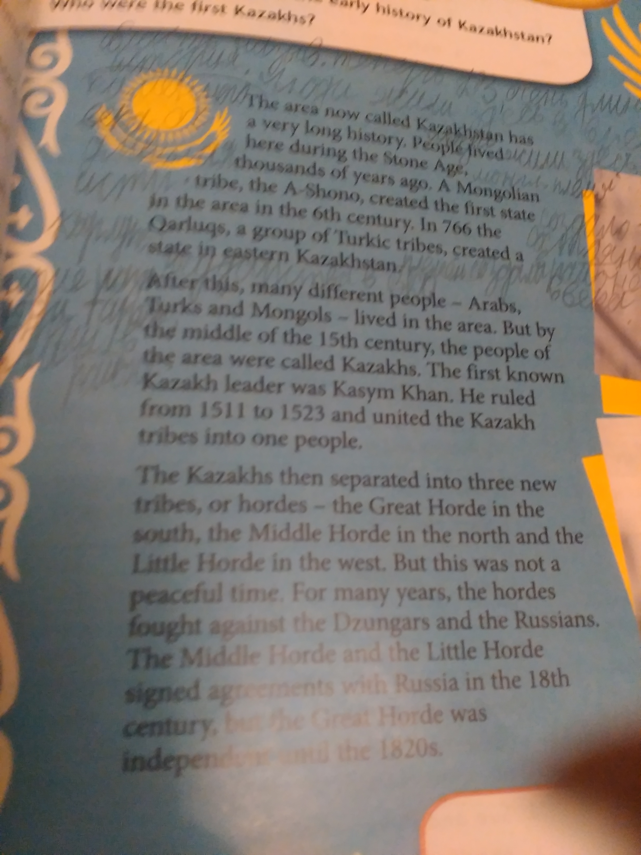 Эта местность, сейчас именуемая Казахстаном, имеет очень долгую историю. Люди жили здесь начиная с каменного века, тысячи лет назад. Племя монгол A - Shono в 6 веке создало здесь первое государство. В 776 Qarluqs - группа тюркских племен создала государство в восточной части Казахстана. После этого много других наций - арабы, турки и монголы здесь жили. Но к середине 15 века, люди, которые жили в этой местности, начали именоваться Казахами. Первым известным лидером казахов был Касым - хан. Он руководил правил с 1511 по 1523 и объединил казахские племена в один народ. Затем казахи разделились на три новых народа или орды - великая орда юга, the (средняя) орда севера и (малая) орда на западе. Но это были не спокойные времена. В течение долгого времени орды сражались против джунгаров и русских. (средняя) орда и (малая) орда подписали в 18 веке соглашение с Россией, но великая орда оставалась независимой до 1820х годов.