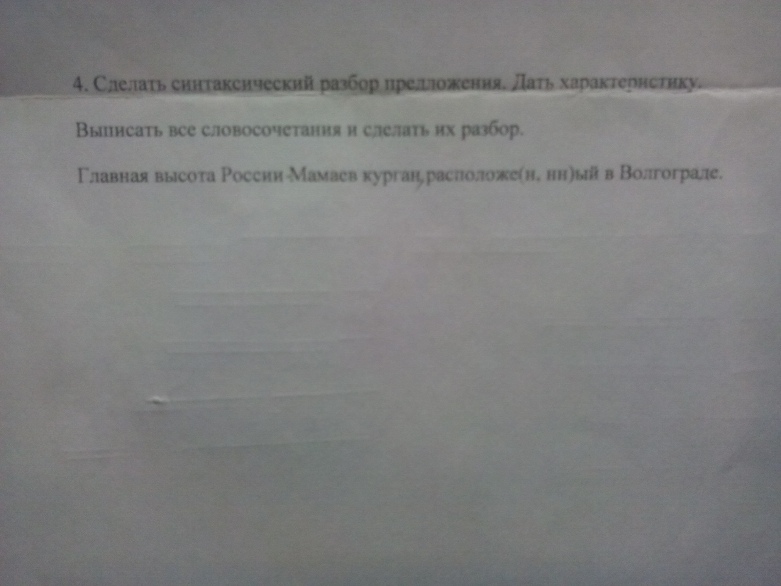 Повест., невоскл., простое, двусост., распр., осложнено причастным оборотом. Основа : Высота - Мамаев курган. - =. Главная - определение~России ---- ( дополнение). Расположенный в Волгограде ( оборот, определение ~ ).