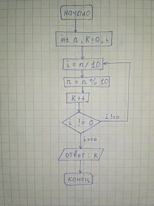 main(){ int n, k = 0, i = 1; while(i != 0) { i = n / 10; n = n % 10; k++; } cout << "Ответ: " << k;}