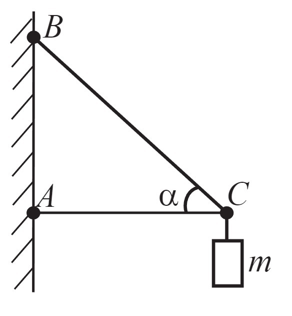Чему равен момент силы тяжести груза массой 60 кг, подвешенного на кронштейне ABC, относительно точки B, если АВ=0,5 м и угол а=45°
