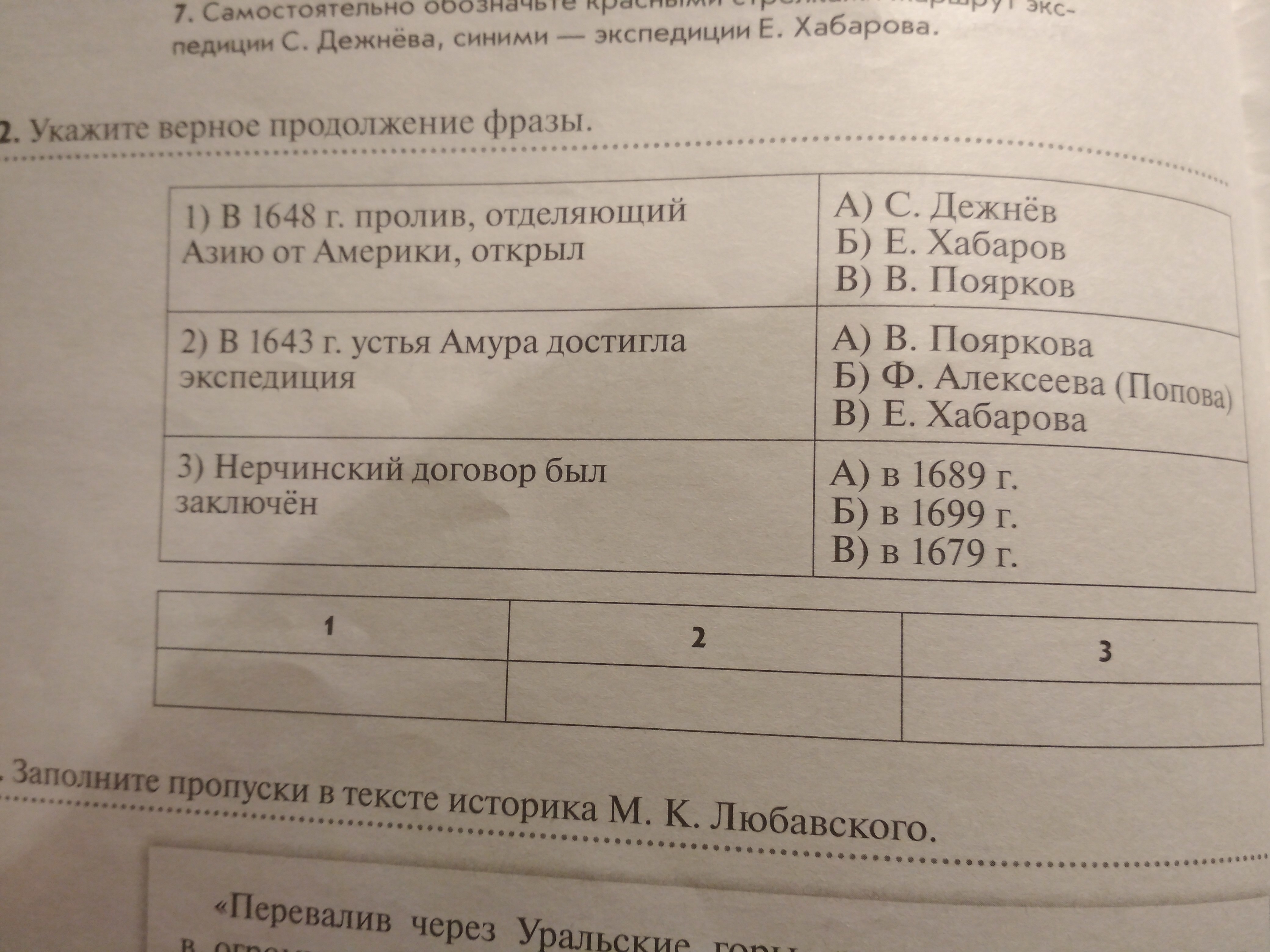 1) В 1648 г. пролив, отделяющий Азию от Америки, открыл С. Дежнёв. 2) В 1643 г. устья Амура достигла экспедиция В. Пояркова. 3) Нерчинский договор был заключён в 1689