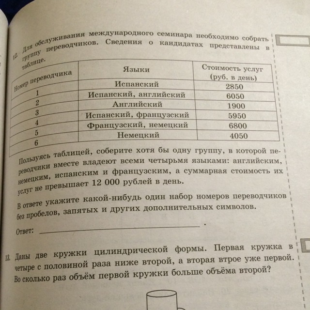 В первом случае, чтобы не нарушить условия, остается взять только первого и второго переводчиков. Стоимость услуг будет 11950 рублей в день. Во втором случае, не нарушая условия, можно взять только второго и третьего переводчика. Стоимость услуг будет как в первом случае. Таким образом, группа переводчиков, удовлетворяющая всем условиям, может быть собрана из переводчиков 2, 3 и 5 или из переводчиков 1, 2 и 4.