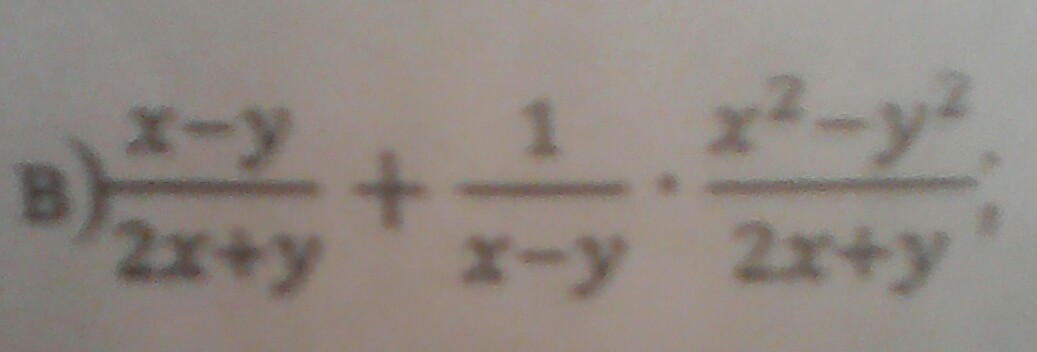 frac{1}{x-y} * frac{ x^{2} - y^{2} }{2x+y}= frac{1}{x-y}* frac{(x-y)(x+y)}{2x+y} = frac{x+y}{2x+y} \\ frac{x-y}{2x+y} + frac{x+y}{2x+y} = frac{x-y+x+y}{2x+y} = frac{2x}{2x+y}