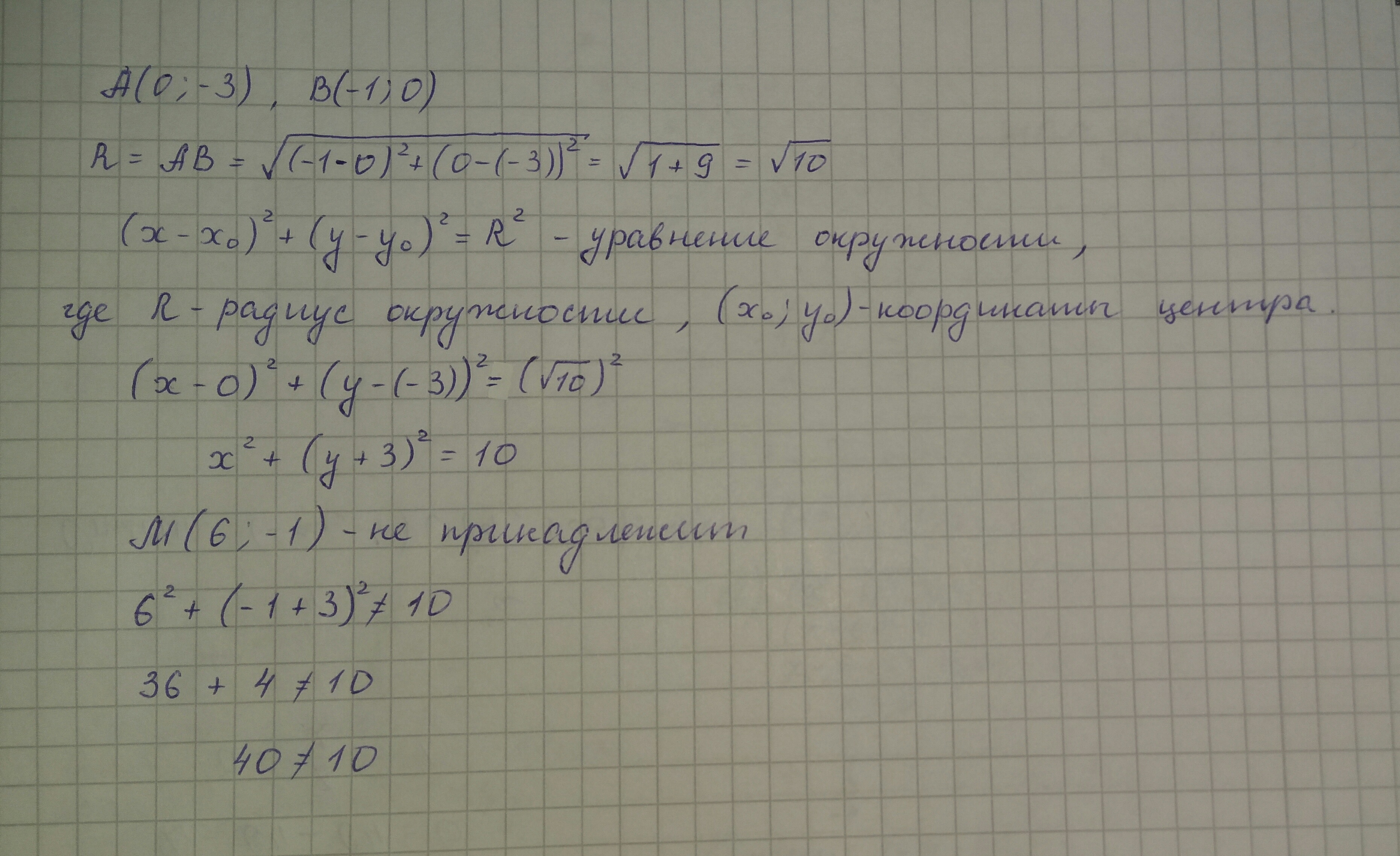 Даны точки А(0;-3), В(-1;0). Запишите уравнение окружности с центрами в точки А и радиусом АВ. Принадлежит ли этой окружности М(6;-1)?