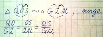 Стороны подобных треугольников, лежащие напротив равных углов, называют соответствующими или сходственными. Их отношения можно записать, не прибегая к чертежу. Из условия (последовательность вершин в обозначении подобных треугольников) следует, что угол Q первого треугольника равен углу G второго треугольника. Тогда стороны OS и ZM, лежащие напротив этих углов сходственные, их записываем в пару. Аналогично рассуждая, получим: