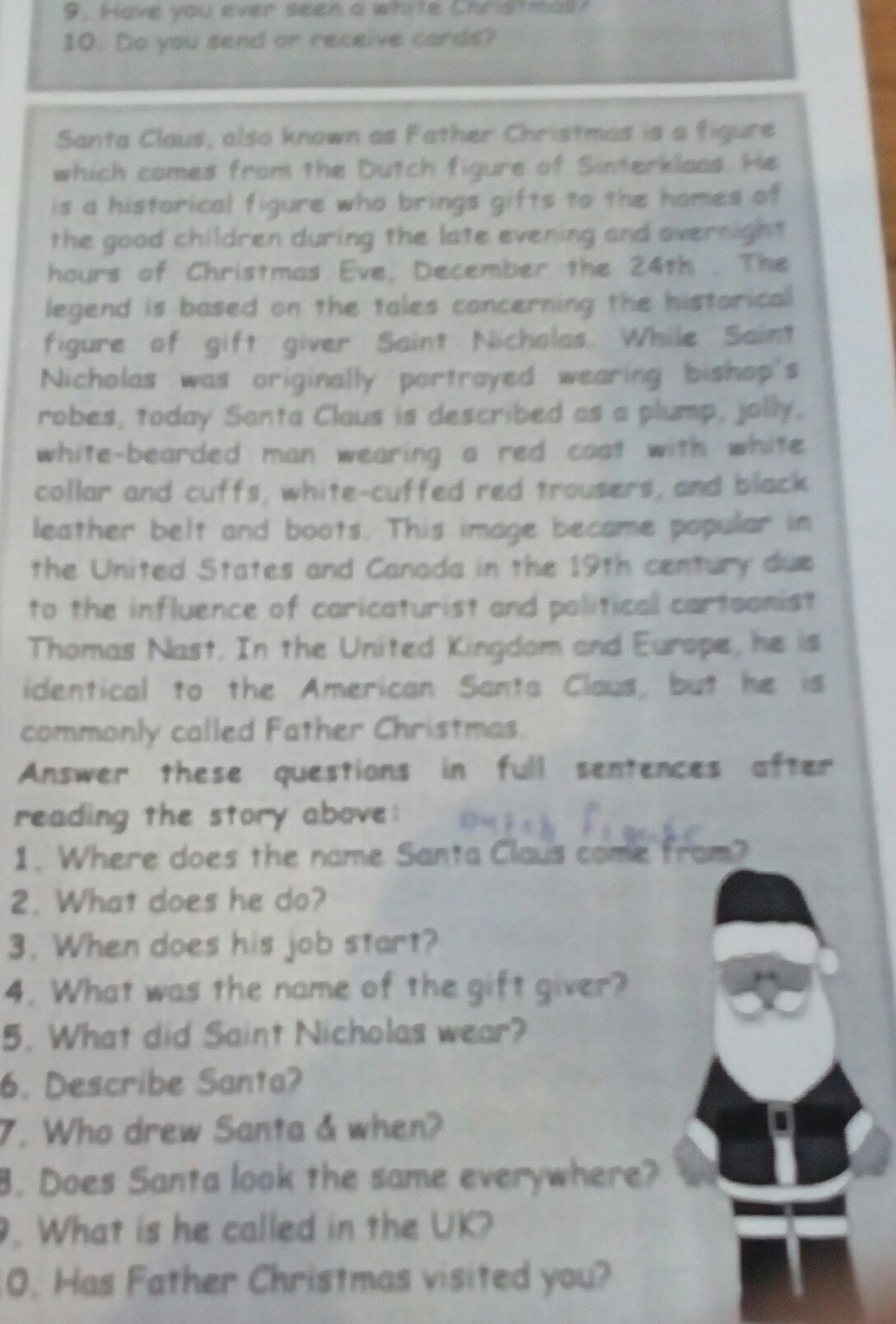 6 Santa Claus is a plump, jally, white-bearded man wearing.....