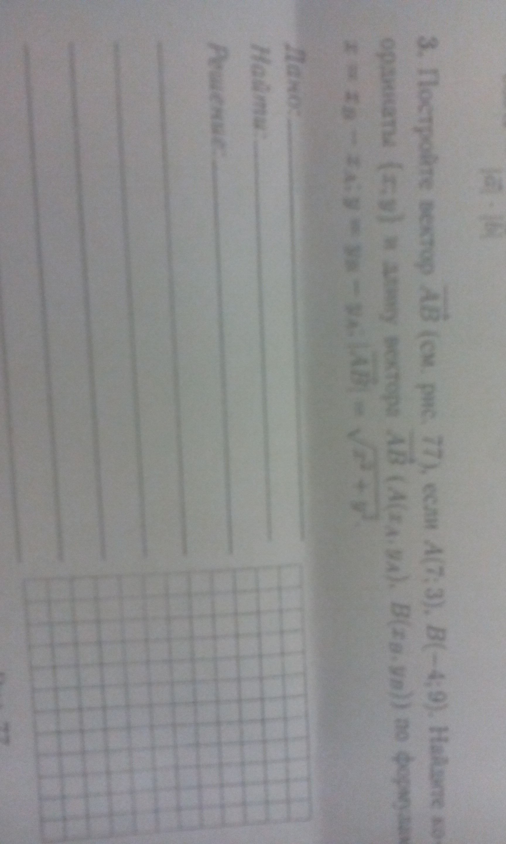 Постройте вектор АВ ,если А(7;3),В(-4,9).Найдите координаты (х,у) и длину вектора АВ.см фо то о