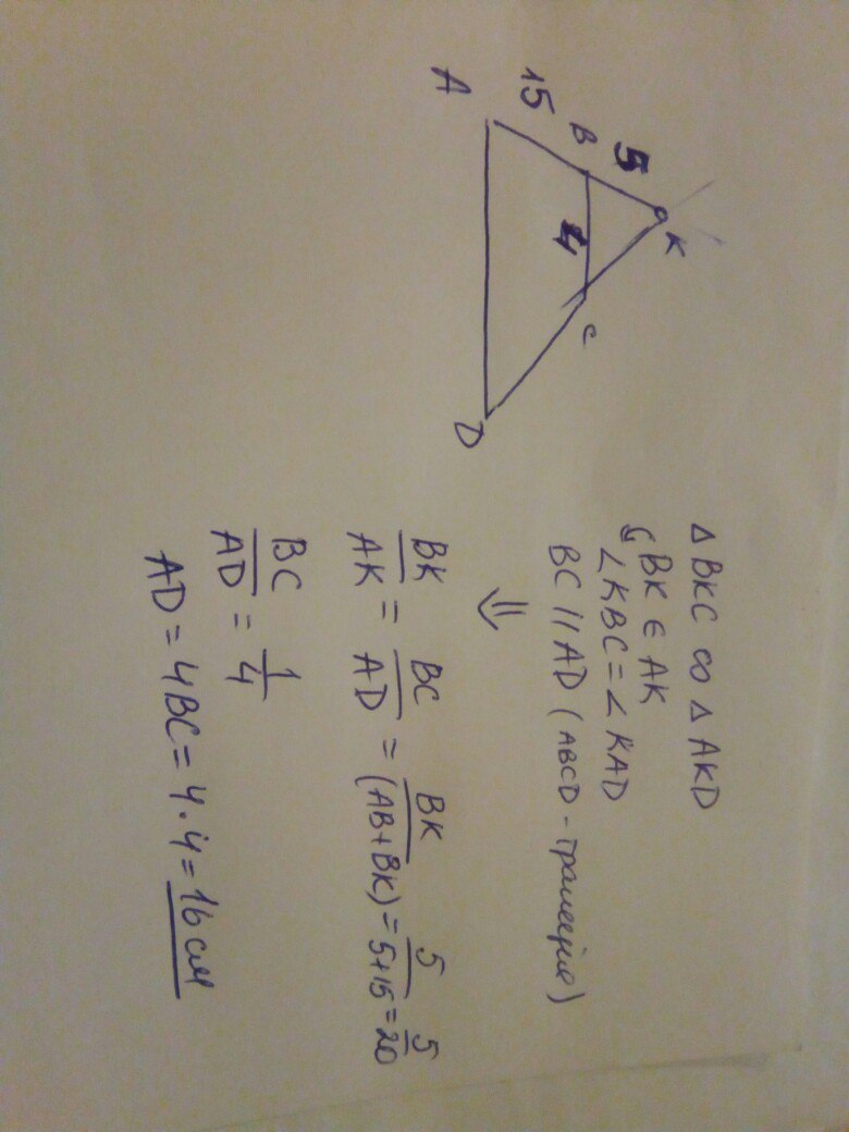 Продовження бічних сторін AB i CD трапеції ABCD перетинаються у точці K.Менша основа BC дорівнює 4 см,BK=5 см,AB.Знайдіть більшу основу трапеції.
