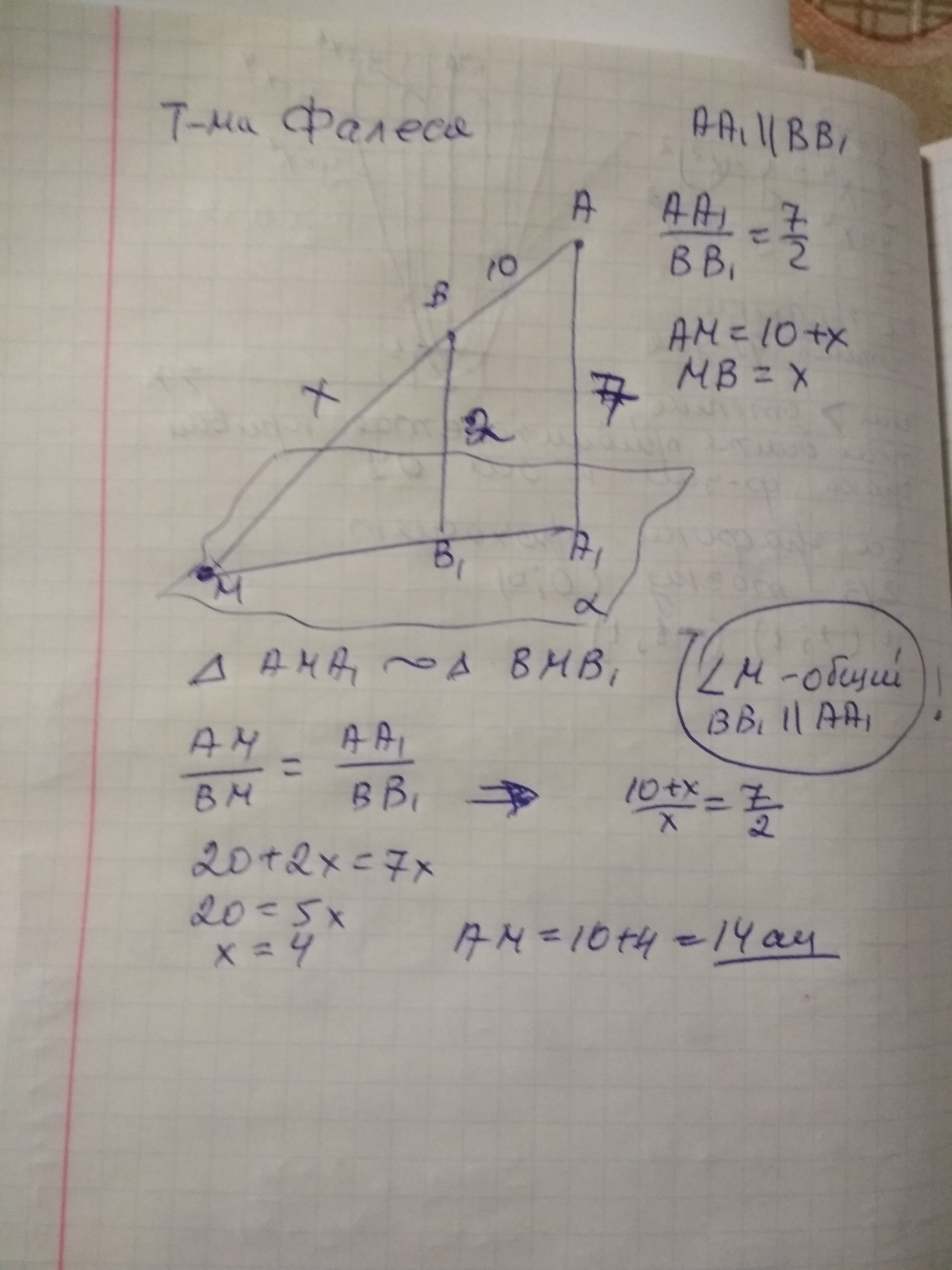 Через точки A и B проведены параллельные прямые,пересекающие плоскость a в точках А1и В1 соответственно .Прямая АВ пересекает плоскость а в точке М.Найдите длину отрезка АМ ,если АB=10см и АА1:BB1=7:2