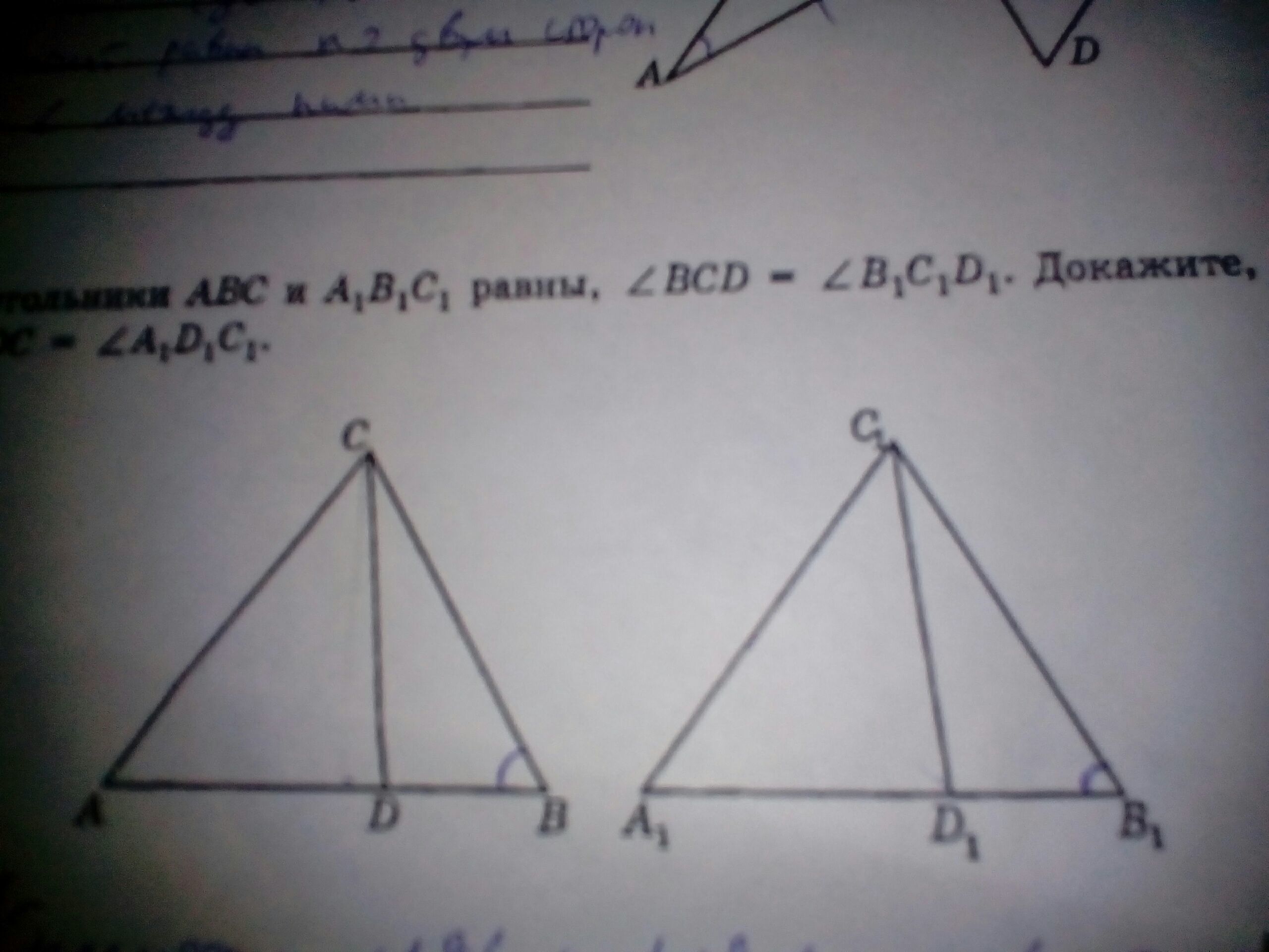 Треугольники ABC и a1b1c1 равны, угол bcd=углу b1c1d1 докажите что угол adc=углу a1d1c1. 7 класс