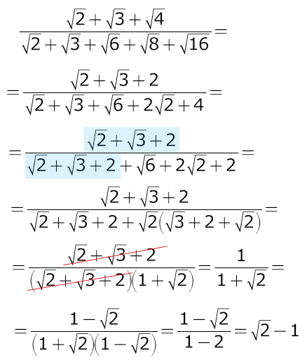 прием стандартный: избавиться от иррациональности в знаменателе, т.е. домножить на сопряженное знаменателю выражение... но очень уж не хотелось))) и удалось удачно сгруппировать...