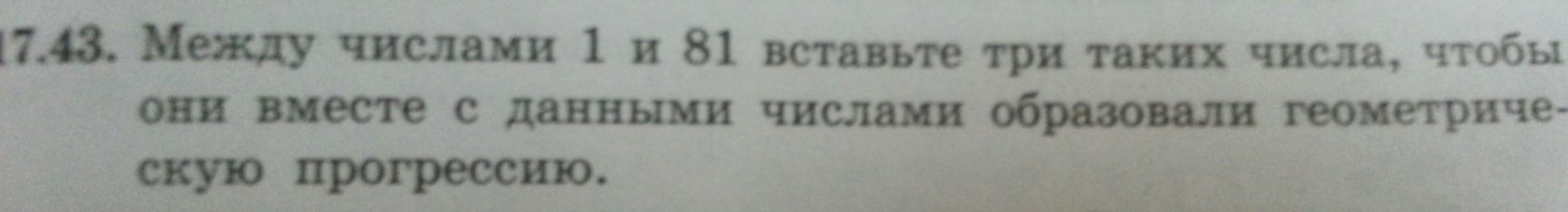 Перефразировав: найти число, которое четвертой степени =81 Получаем 3 и тогда геом. послед. будет 1, 3, 9, 27, 81