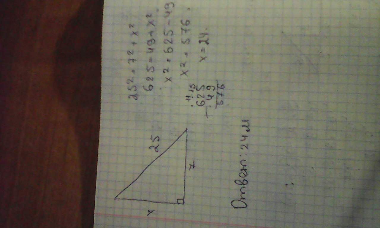 6. К вертикальной стенке прислонили лестницу. Длина лестницы равна 25 м. Конец лестницы, опирающийся на землю, находится на расстоянии 7 м от стены. Вычисли, на каком расстоянии от земли находится второй конец лестницы.