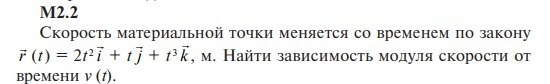 Полная скорость V(t)=корень((Vx)^2+(Vy)^2+(Vz)^2)=корень(t^4+t^2+t^6)=t· корень(t^4+t^2+1).