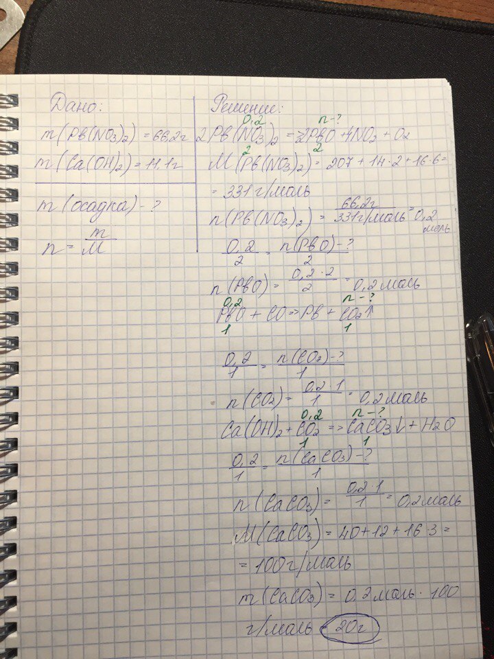 Твёрдый продукт, полученный при прокалтвании 66.2 г нитрата свинца (II), восстановили монооксидом углерода. Определите массу осадка, который выпадет, если полученный после восстановления газ пропустить через раствор, содержащий 11.1 г гидроксида кальция.