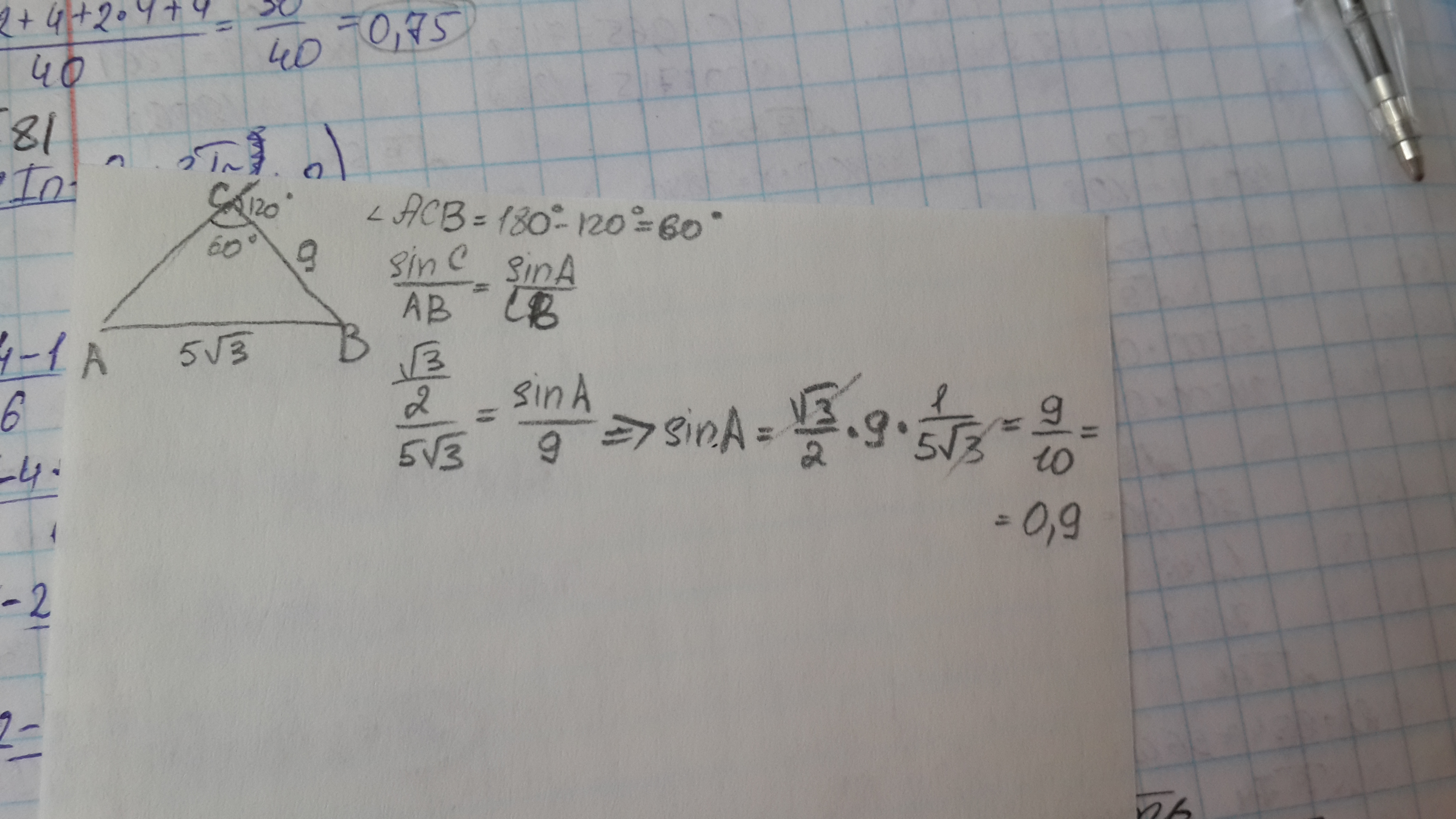 В треугольнике АВС внешний угол пр вершине с ранен 120°, АВ=5 коней из 3, ВС=9. Найдите sinA. Плиз срочно