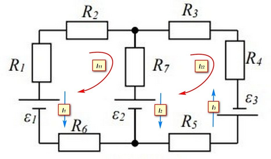 Для каждого контура запишем уравнение по второму закону Кирхгофа