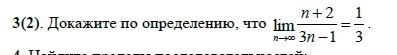 lim[(n+2)/(3n-1)]=lm[n(1+2/n)/n(3-1/n)]=lim[(1+2/n)/(3-1/n)]=(1+0)/(3-0)=1/3