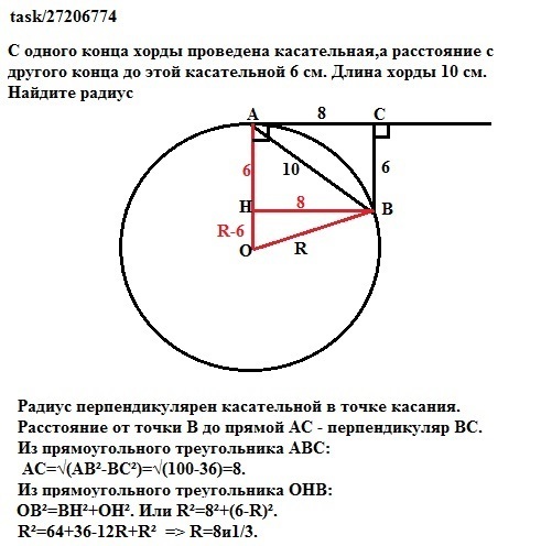 С одного конца хорды проведена касательная,а расстояние с другого конца до этой касательной 6 см. Длина хорды 10 см. Найдите радиус. С рисунком пожалуйста ((