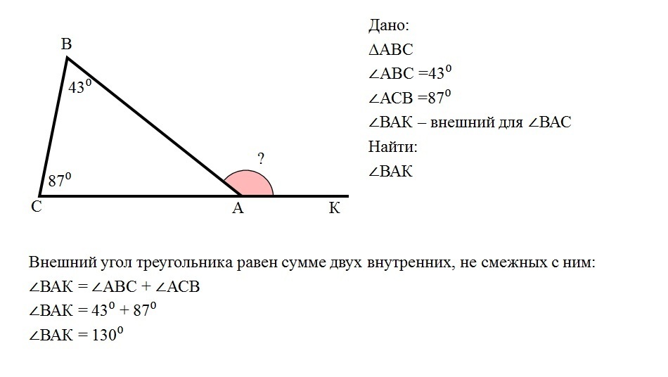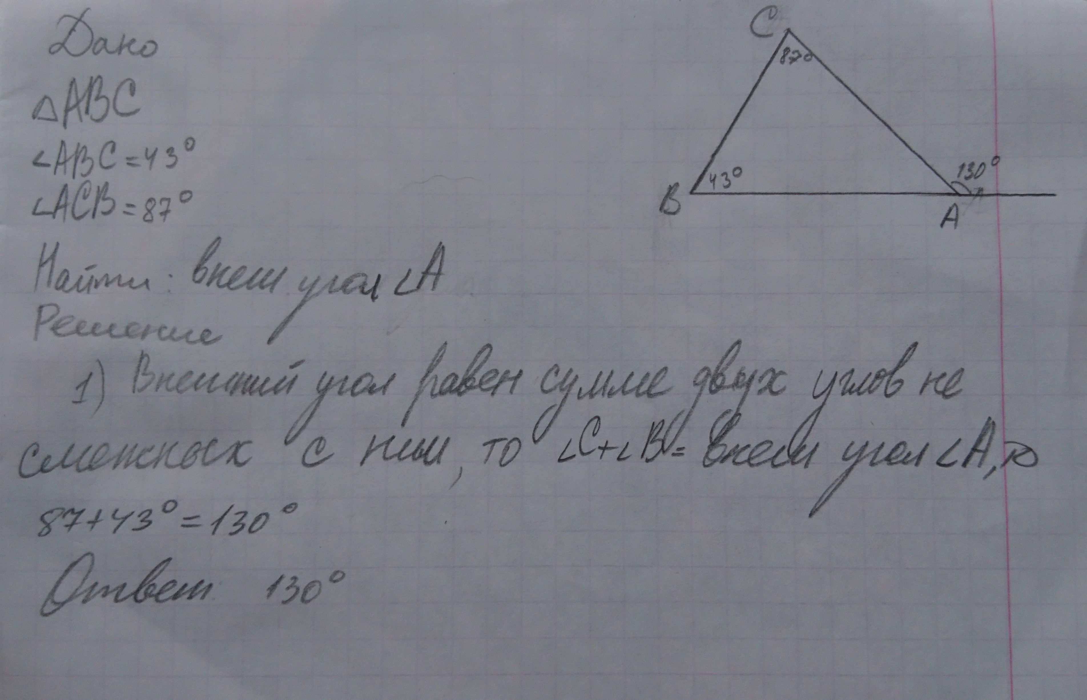 В треугольнике АВС угол АВС =43 градуса , угол АСВ =87 градуса . Найдите внешний угол при вершине А , ответь дайте проностью на чертеже
