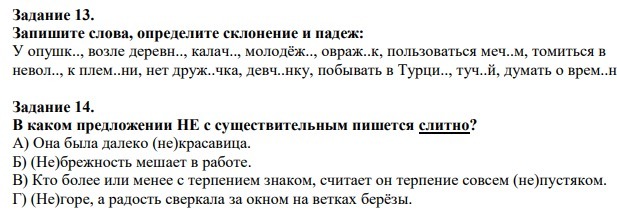 У опушкИ ( 1 скл. Р.п.) , возле деревнИ (1 скл. Р.п.) ,калач ( 2 скл. падеж определить нельзя. Может быть И.п. или В.п.) , молодёжЬ ( 3 скл. падеж определить нельзя. Может быть И.п. или В.п.) , овражЕк (2 скл. Может быть И.п. или В.п.) , пользоваться мечОм ( 2 скл. Т.п.) , томиться в неволЕ( 1 скл. П.п.) , к племЕни ( 1 скл. Д.п.), нет дружОчка ( 2 скл. Р.п.), девчОнку ( 1 скл. В.п.) , побывать в ТурциИ ( 1 скл. П.п.),тучЕй (1 скл.Т.п.) думать о времЕни ( П.п)