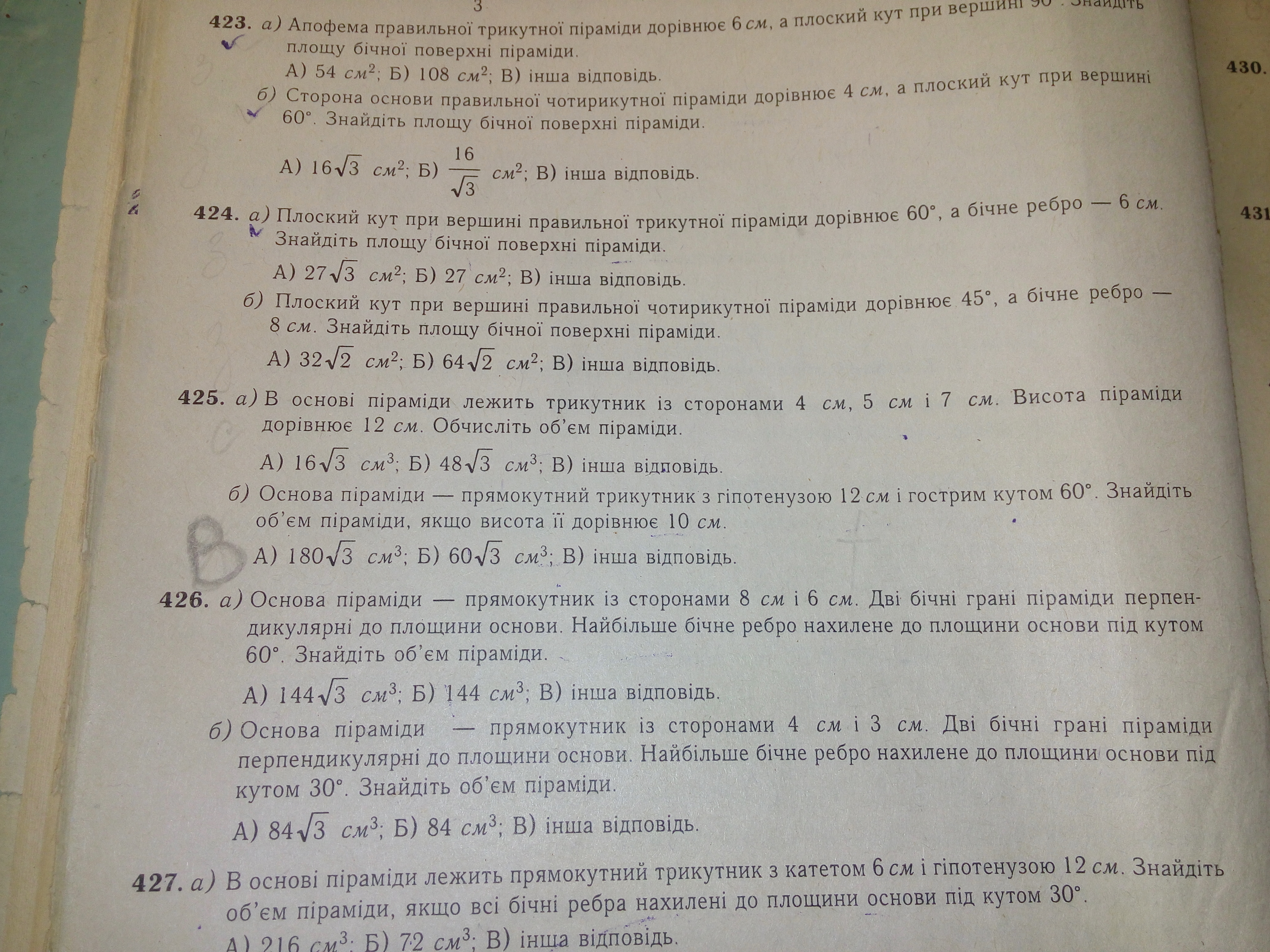 425.б) Дана пирамида, в основании которой прямоугольный треугольник с гипотенузой в 12 см и острым углом в 60°. Высота пирамиды Н = 10 см. Найти объём пирамиды.