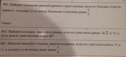 Снова по теореме косинусов, в качестве сторон треугольника выступают половинки диагоналей и боковая сторона параллелограмма