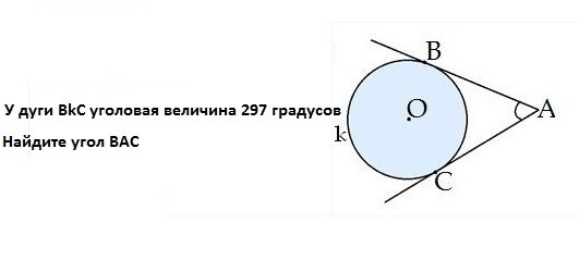 Окружность составляет 360 градусов, тогда дуга ВjC(я так её обозначил) равна: 360-297=63 градусам. Проведём радиусы к точкам В и С и соединим точки В и С. У нас получился треугольник ВОС, рассмотрим его. Он является равнобедренным, т.к ВО=ОС=r. Значит, угол ОВС=углу ОСВ=(180-63)/2=58,5 градусам-по свойству равнобедренного треугольника. ВА и СА являются касательными, значит они перпендикулярны к радиусам ОВ и ОС (касательная перпендикулярна к радиусу, проведённому в точку касания). Значит, угол ОВА= углу ОСА=90 градусам. Рассмотрим треугольник АВС. Угол АВС=90-58,5=31,5 градусам. Аналогично с углом ОСА(=31,5 градусам). Значит, угол ВАС=180-(31,5+31,5)=180-63=117 градусам.