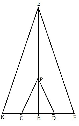 В равнобедренном треугольнике EFK с основанием FK на медиане EH взята точка Р и на основании отложены равные отрезки HC и HD.Докажите,что треугольник CDP-равнобедренный